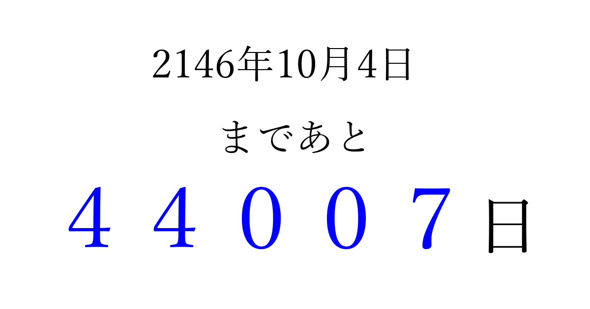 2146年10月4日(火)まで あと 99999 日です 追加すると、トップページからすぐ選べるようになります ※2026/04/09現在の結果です。 最新の状態に更新する ↓シェアして、タイムライン上にカウントダウンを表示しよう!↓ 📤 この結果を共有する Tweet シェア Threads Bluesky 別の日付でカウントダウン 2146年10月のカレンダー このページをブックマークに追加すると、いつでもカウントダウンを確認できます。 (PC: Ctrl+D / Mac: ⌘+D) hitome-notes.comでは以下のページも運営しています。 指定日と期間から日付を計算 | ガチャ確率計算・シミュレーション | プライバシー・ポリシー 運営者:Avocado
