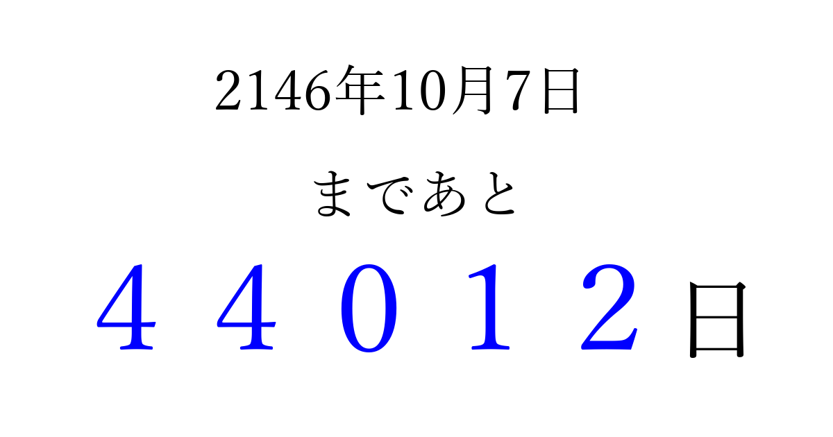 2146年10月7日(金)まで あと 99999 日です 追加すると、トップページからすぐ選べるようになります ※2026/04/07現在の結果です。 最新の状態に更新する ↓シェアして、タイムライン上にカウントダウンを表示しよう!↓ 📤 この結果を共有する Tweet シェア Threads Bluesky 別の日付でカウントダウン 2146年10月のカレンダー このページをブックマークに追加すると、いつでもカウントダウンを確認できます。 (PC: Ctrl+D / Mac: ⌘+D) hitome-notes.comでは以下のページも運営しています。 指定日と期間から日付を計算 | ガチャ確率計算・シミュレーション | プライバシー・ポリシー 運営者:Avocado