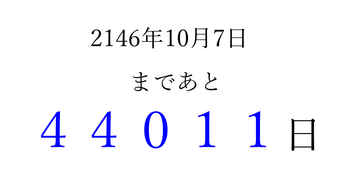 2146年10月7日(金)まで あと 99999 日です 追加すると、トップページからすぐ選べるようになります ※2026/04/08現在の結果です。 最新の状態に更新する ↓シェアして、タイムライン上にカウントダウンを表示しよう!↓ 📤 この結果を共有する Tweet シェア Threads Bluesky 別の日付でカウントダウン 2146年10月のカレンダー このページをブックマークに追加すると、いつでもカウントダウンを確認できます。 (PC: Ctrl+D / Mac: ⌘+D) hitome-notes.comでは以下のページも運営しています。 指定日と期間から日付を計算 | ガチャ確率計算・シミュレーション | プライバシー・ポリシー 運営者:Avocado