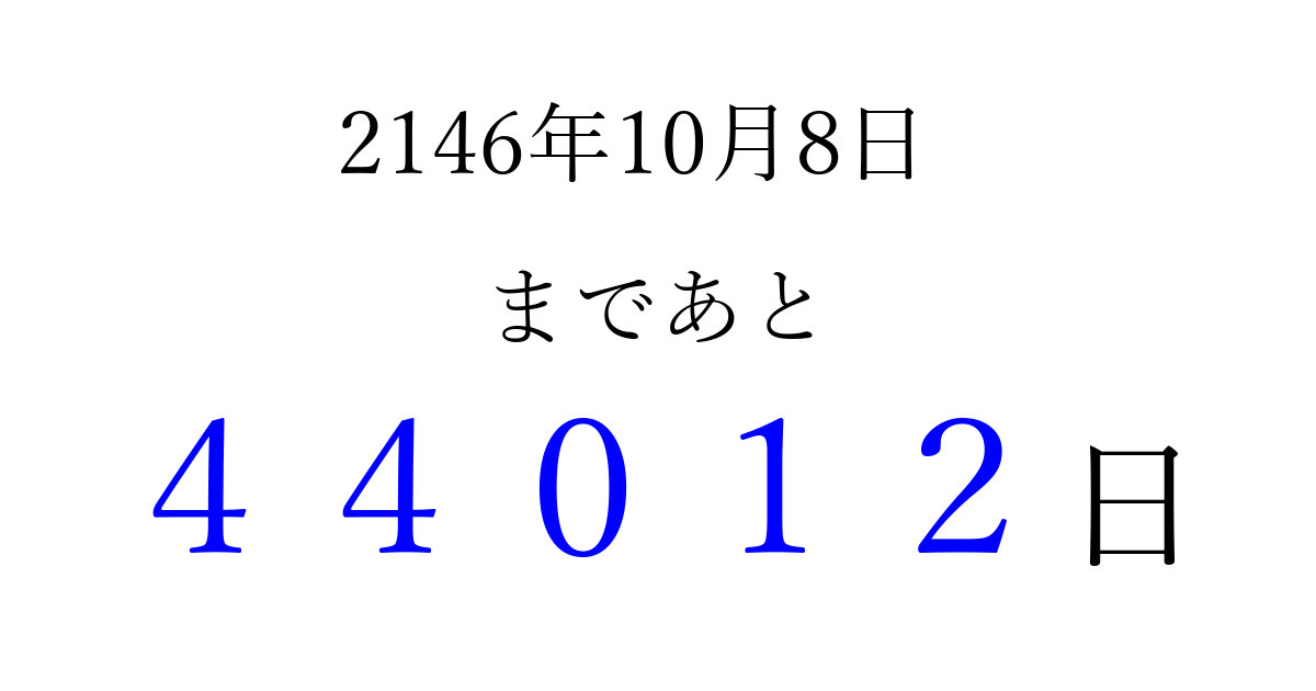 2146年10月8日(土)まで あと 99999 日です 追加すると、トップページからすぐ選べるようになります ※2026/04/08現在の結果です。 最新の状態に更新する ↓シェアして、タイムライン上にカウントダウンを表示しよう!↓ 📤 この結果を共有する Tweet シェア Threads Bluesky 別の日付でカウントダウン 2146年10月のカレンダー このページをブックマークに追加すると、いつでもカウントダウンを確認できます。 (PC: Ctrl+D / Mac: ⌘+D) hitome-notes.comでは以下のページも運営しています。 指定日と期間から日付を計算 | ガチャ確率計算・シミュレーション | プライバシー・ポリシー 運営者:Avocado