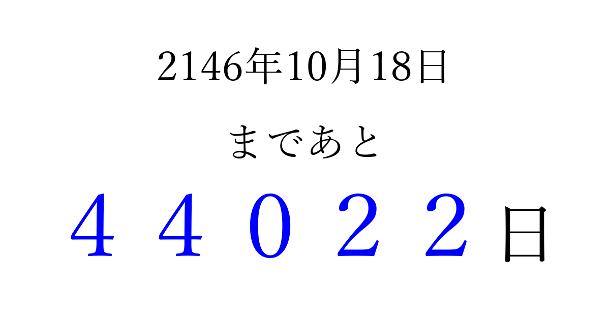 2146年10月18日(火)まで あと 99999 日です 追加すると、トップページからすぐ選べるようになります ※2026/04/08現在の結果です。 最新の状態に更新する ↓シェアして、タイムライン上にカウントダウンを表示しよう!↓ 📤 この結果を共有する Tweet シェア Threads Bluesky 別の日付でカウントダウン 2146年10月のカレンダー このページをブックマークに追加すると、いつでもカウントダウンを確認できます。 (PC: Ctrl+D / Mac: ⌘+D) hitome-notes.comでは以下のページも運営しています。 指定日と期間から日付を計算 | ガチャ確率計算・シミュレーション | プライバシー・ポリシー 運営者:Avocado