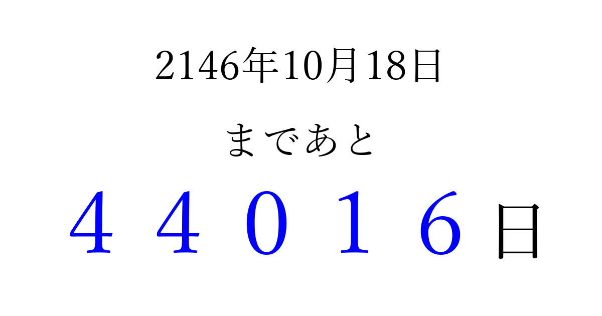 2146年10月18日(火)まで あと 99999 日です 追加すると、トップページからすぐ選べるようになります ※2026/04/14現在の結果です。 最新の状態に更新する ↓シェアして、タイムライン上にカウントダウンを表示しよう!↓ 📤 この結果を共有する Tweet シェア Threads Bluesky 別の日付でカウントダウン 2146年10月のカレンダー このページをブックマークに追加すると、いつでもカウントダウンを確認できます。 (PC: Ctrl+D / Mac: ⌘+D) hitome-notes.comでは以下のページも運営しています。 指定日と期間から日付を計算 | ガチャ確率計算・シミュレーション | プライバシー・ポリシー 運営者:Avocado