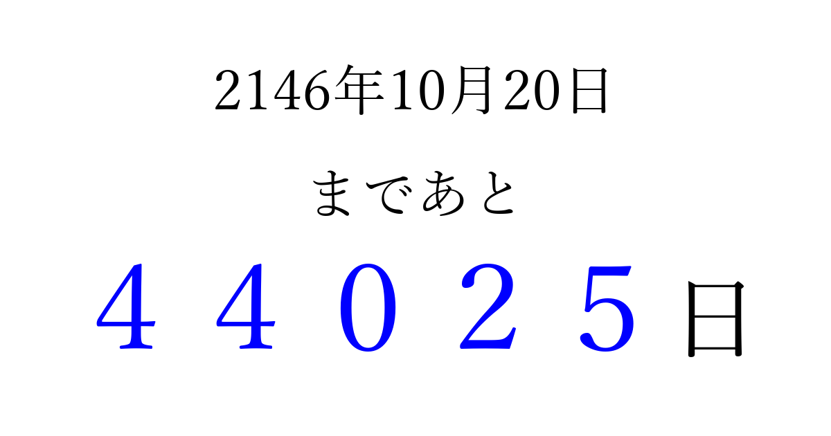 2146年10月20日(木)まで あと 99999 日です 追加すると、トップページからすぐ選べるようになります ※2026/04/07現在の結果です。 最新の状態に更新する ↓シェアして、タイムライン上にカウントダウンを表示しよう!↓ 📤 この結果を共有する Tweet シェア Threads Bluesky 別の日付でカウントダウン 2146年10月のカレンダー このページをブックマークに追加すると、いつでもカウントダウンを確認できます。 (PC: Ctrl+D / Mac: ⌘+D) hitome-notes.comでは以下のページも運営しています。 指定日と期間から日付を計算 | ガチャ確率計算・シミュレーション | プライバシー・ポリシー 運営者:Avocado
