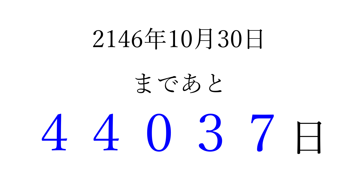 2146年10月30日(日)まで あと 99999 日です 追加すると、トップページからすぐ選べるようになります ※2026/04/05現在の結果です。 最新の状態に更新する ↓シェアして、タイムライン上にカウントダウンを表示しよう!↓ 📤 この結果を共有する Tweet シェア Threads Bluesky 別の日付でカウントダウン 2146年10月のカレンダー このページをブックマークに追加すると、いつでもカウントダウンを確認できます。 (PC: Ctrl+D / Mac: ⌘+D) hitome-notes.comでは以下のページも運営しています。 指定日と期間から日付を計算 | ガチャ確率計算・シミュレーション | プライバシー・ポリシー 運営者:Avocado