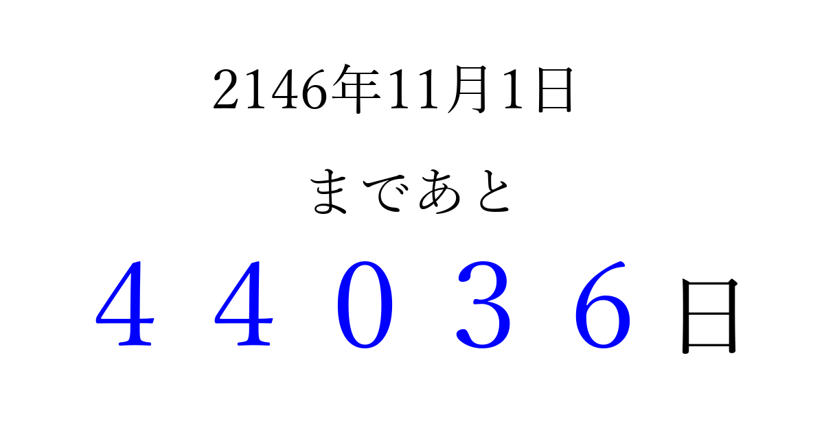 2146年11月1日(火)まで あと 99999 日です 追加すると、トップページからすぐ選べるようになります ※2026/04/08現在の結果です。 最新の状態に更新する ↓シェアして、タイムライン上にカウントダウンを表示しよう!↓ 📤 この結果を共有する Tweet シェア Threads Bluesky 別の日付でカウントダウン 2146年11月のカレンダー このページをブックマークに追加すると、いつでもカウントダウンを確認できます。 (PC: Ctrl+D / Mac: ⌘+D) hitome-notes.comでは以下のページも運営しています。 指定日と期間から日付を計算 | ガチャ確率計算・シミュレーション | プライバシー・ポリシー 運営者:Avocado