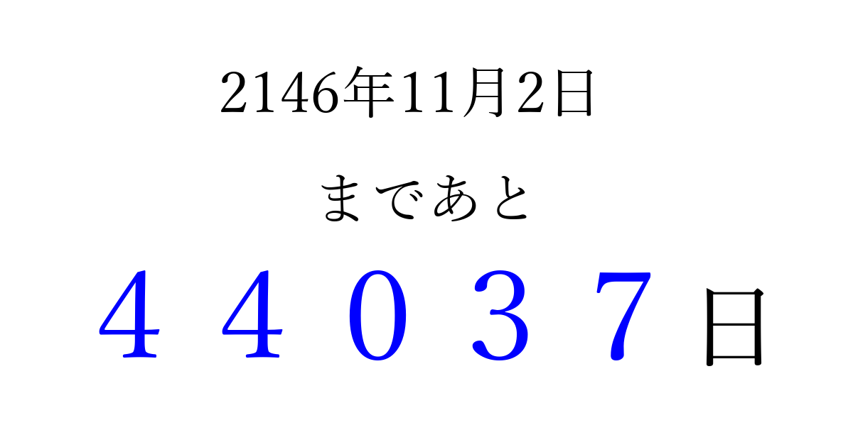2146年11月2日(水)まで あと 99999 日です 追加すると、トップページからすぐ選べるようになります ※2026/04/08現在の結果です。 最新の状態に更新する ↓シェアして、タイムライン上にカウントダウンを表示しよう!↓ 📤 この結果を共有する Tweet シェア Threads Bluesky 別の日付でカウントダウン 2146年11月のカレンダー このページをブックマークに追加すると、いつでもカウントダウンを確認できます。 (PC: Ctrl+D / Mac: ⌘+D) hitome-notes.comでは以下のページも運営しています。 指定日と期間から日付を計算 | ガチャ確率計算・シミュレーション | プライバシー・ポリシー 運営者:Avocado