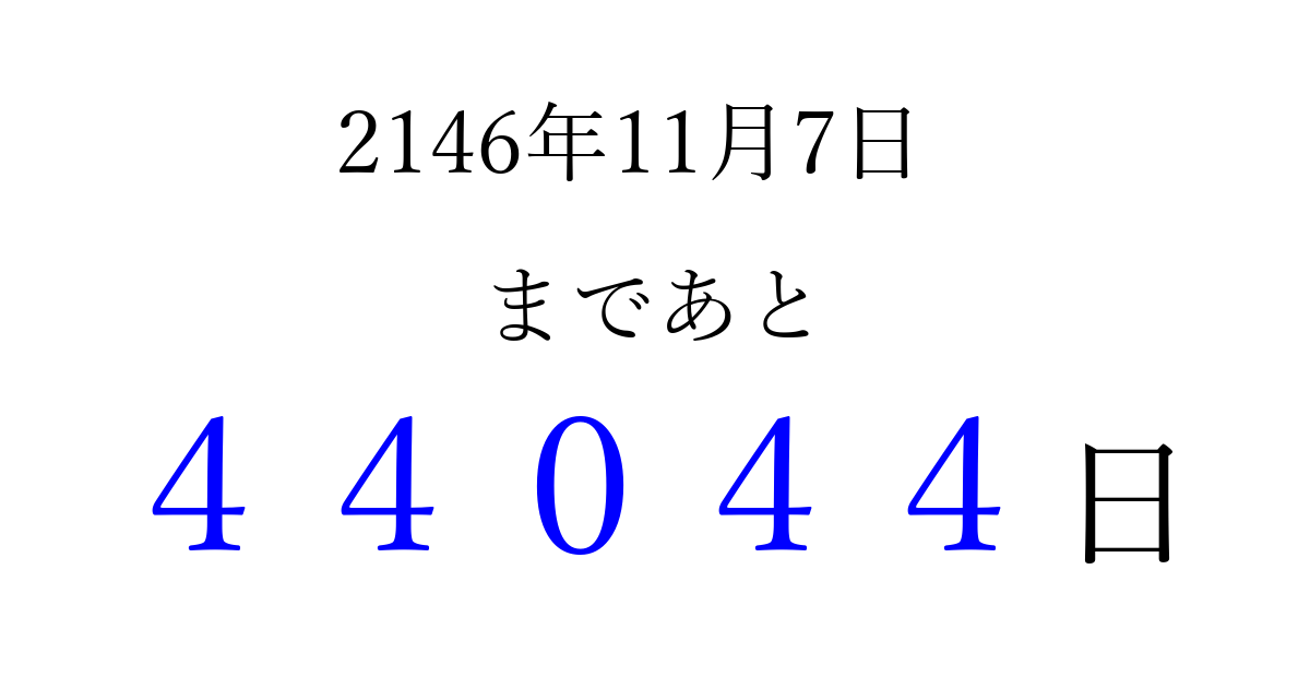 2146年11月7日(月)まで あと 99999 日です 追加すると、トップページからすぐ選べるようになります ※2026/04/06現在の結果です。 最新の状態に更新する ↓シェアして、タイムライン上にカウントダウンを表示しよう!↓ 📤 この結果を共有する Tweet シェア Threads Bluesky 別の日付でカウントダウン 2146年11月のカレンダー このページをブックマークに追加すると、いつでもカウントダウンを確認できます。 (PC: Ctrl+D / Mac: ⌘+D) hitome-notes.comでは以下のページも運営しています。 指定日と期間から日付を計算 | ガチャ確率計算・シミュレーション | プライバシー・ポリシー 運営者:Avocado