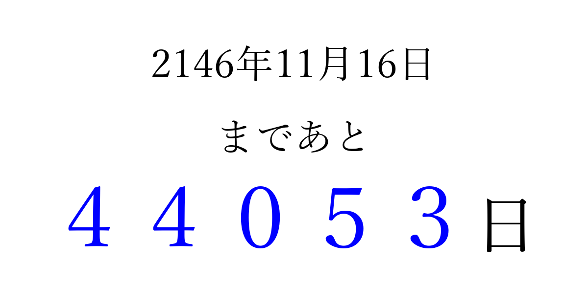 2146年11月16日(水)まで あと 99999 日です 追加すると、トップページからすぐ選べるようになります ※2026/04/06現在の結果です。 最新の状態に更新する ↓シェアして、タイムライン上にカウントダウンを表示しよう!↓ 📤 この結果を共有する Tweet シェア Threads Bluesky 別の日付でカウントダウン 2146年11月のカレンダー このページをブックマークに追加すると、いつでもカウントダウンを確認できます。 (PC: Ctrl+D / Mac: ⌘+D) hitome-notes.comでは以下のページも運営しています。 指定日と期間から日付を計算 | ガチャ確率計算・シミュレーション | プライバシー・ポリシー 運営者:Avocado