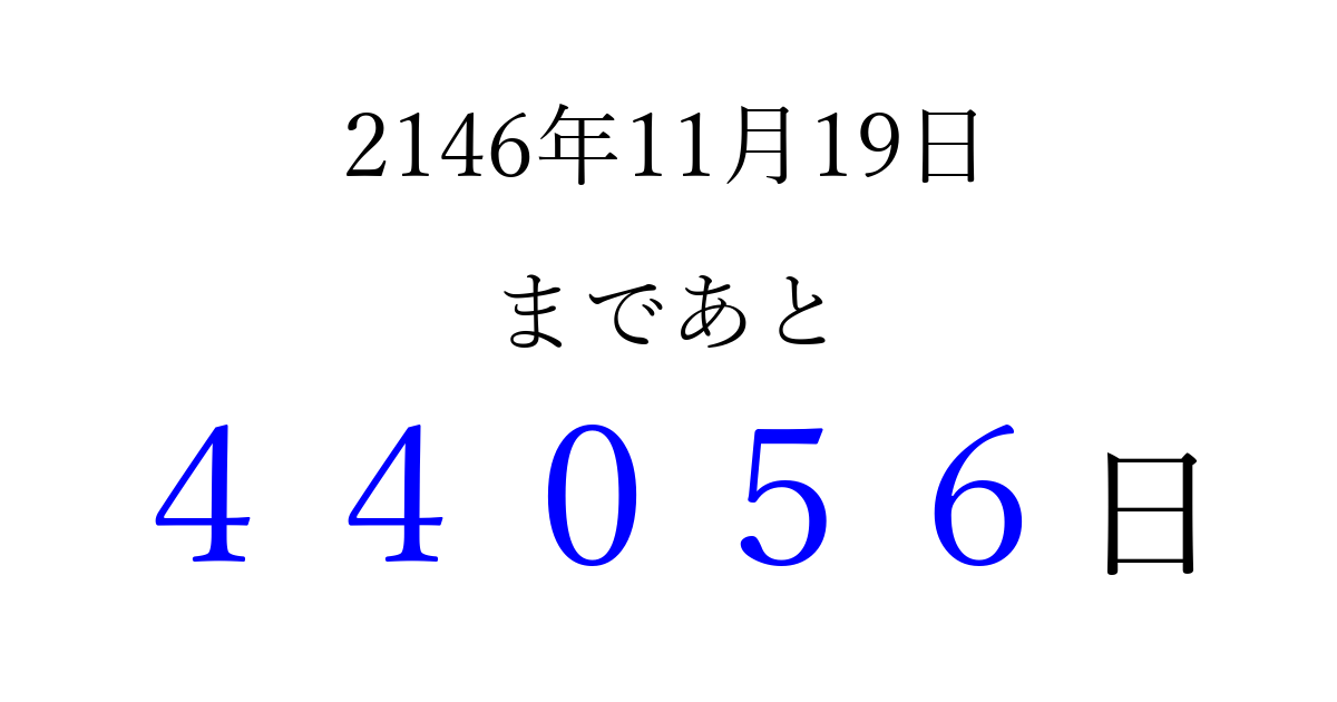 2146年11月19日(土)まで あと 99999 日です 追加すると、トップページからすぐ選べるようになります ※2026/04/06現在の結果です。 最新の状態に更新する ↓シェアして、タイムライン上にカウントダウンを表示しよう!↓ 📤 この結果を共有する Tweet シェア Threads Bluesky 別の日付でカウントダウン 2146年11月のカレンダー このページをブックマークに追加すると、いつでもカウントダウンを確認できます。 (PC: Ctrl+D / Mac: ⌘+D) hitome-notes.comでは以下のページも運営しています。 指定日と期間から日付を計算 | ガチャ確率計算・シミュレーション | プライバシー・ポリシー 運営者:Avocado