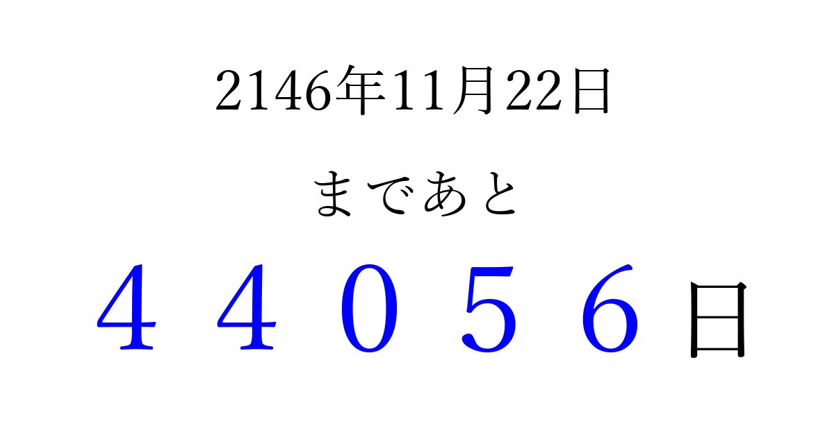 2146年11月22日(火)まで あと 99999 日です 追加すると、トップページからすぐ選べるようになります ※2026/04/09現在の結果です。 最新の状態に更新する ↓シェアして、タイムライン上にカウントダウンを表示しよう!↓ 📤 この結果を共有する Tweet シェア Threads Bluesky 別の日付でカウントダウン 2146年11月のカレンダー このページをブックマークに追加すると、いつでもカウントダウンを確認できます。 (PC: Ctrl+D / Mac: ⌘+D) hitome-notes.comでは以下のページも運営しています。 指定日と期間から日付を計算 | ガチャ確率計算・シミュレーション | プライバシー・ポリシー 運営者:Avocado