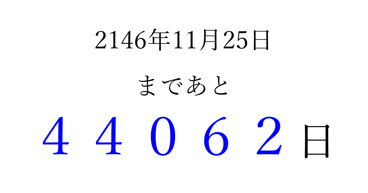 2146年11月25日(金)まで あと 99999 日です 追加すると、トップページからすぐ選べるようになります ※2026/04/06現在の結果です。 最新の状態に更新する ↓シェアして、タイムライン上にカウントダウンを表示しよう!↓ 📤 この結果を共有する Tweet シェア Threads Bluesky 別の日付でカウントダウン 2146年11月のカレンダー このページをブックマークに追加すると、いつでもカウントダウンを確認できます。 (PC: Ctrl+D / Mac: ⌘+D) hitome-notes.comでは以下のページも運営しています。 指定日と期間から日付を計算 | ガチャ確率計算・シミュレーション | プライバシー・ポリシー 運営者:Avocado