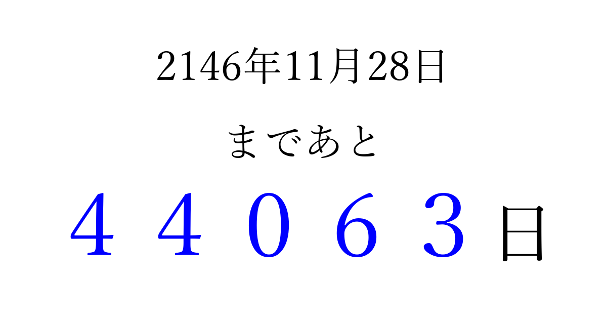 2146年11月28日(月)まで あと 99999 日です 追加すると、トップページからすぐ選べるようになります ※2026/04/08現在の結果です。 最新の状態に更新する ↓シェアして、タイムライン上にカウントダウンを表示しよう!↓ 📤 この結果を共有する Tweet シェア Threads Bluesky 別の日付でカウントダウン 2146年11月のカレンダー このページをブックマークに追加すると、いつでもカウントダウンを確認できます。 (PC: Ctrl+D / Mac: ⌘+D) hitome-notes.comでは以下のページも運営しています。 指定日と期間から日付を計算 | ガチャ確率計算・シミュレーション | プライバシー・ポリシー 運営者:Avocado