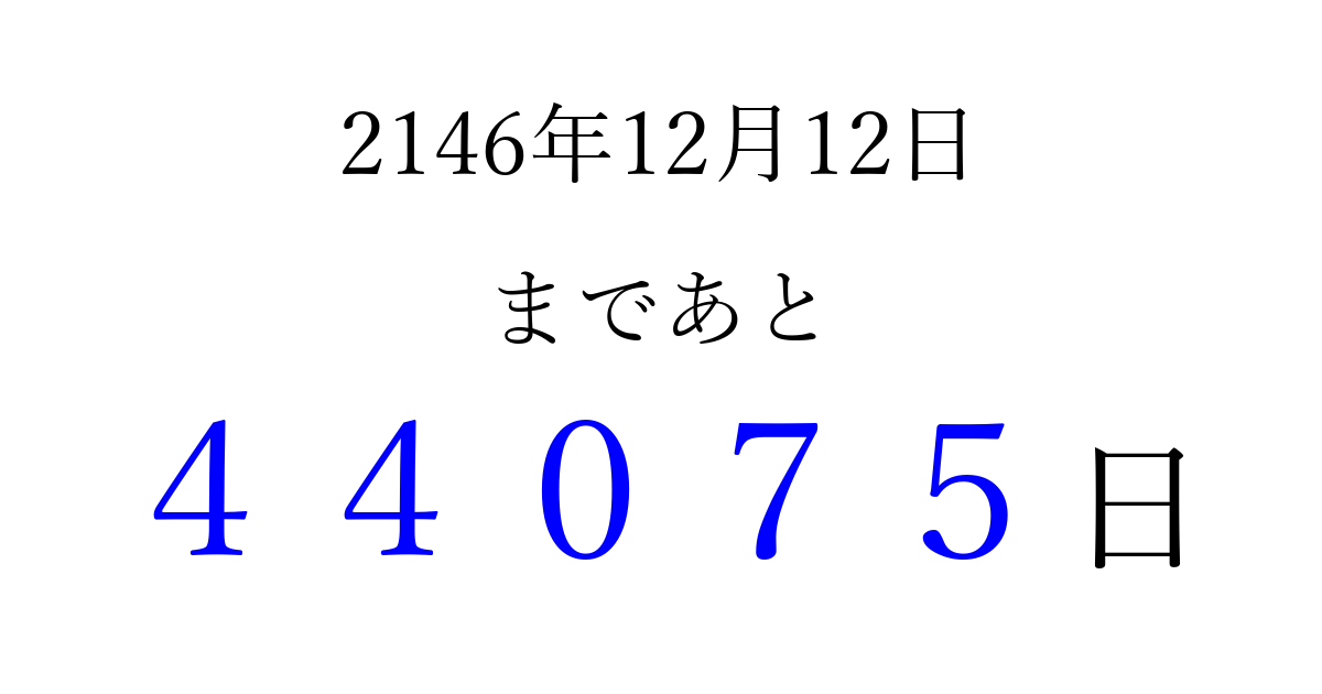 2146年12月12日(月)まで あと 99999 日です 追加すると、トップページからすぐ選べるようになります ※2026/04/10現在の結果です。 最新の状態に更新する ↓シェアして、タイムライン上にカウントダウンを表示しよう!↓ 📤 この結果を共有する Tweet シェア Threads Bluesky 別の日付でカウントダウン 2146年12月のカレンダー このページをブックマークに追加すると、いつでもカウントダウンを確認できます。 (PC: Ctrl+D / Mac: ⌘+D) hitome-notes.comでは以下のページも運営しています。 指定日と期間から日付を計算 | ガチャ確率計算・シミュレーション | プライバシー・ポリシー 運営者:Avocado
