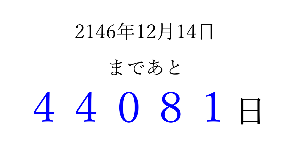2146年12月14日(水)まで あと 99999 日です 追加すると、トップページからすぐ選べるようになります ※2026/04/06現在の結果です。 最新の状態に更新する ↓シェアして、タイムライン上にカウントダウンを表示しよう!↓ 📤 この結果を共有する Tweet シェア Threads Bluesky 別の日付でカウントダウン 2146年12月のカレンダー このページをブックマークに追加すると、いつでもカウントダウンを確認できます。 (PC: Ctrl+D / Mac: ⌘+D) hitome-notes.comでは以下のページも運営しています。 指定日と期間から日付を計算 | ガチャ確率計算・シミュレーション | プライバシー・ポリシー 運営者:Avocado