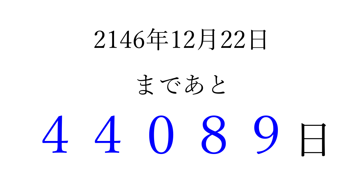 2146年12月22日(木)まで あと 99999 日です 追加すると、トップページからすぐ選べるようになります ※2026/04/06現在の結果です。 最新の状態に更新する ↓シェアして、タイムライン上にカウントダウンを表示しよう!↓ 📤 この結果を共有する Tweet シェア Threads Bluesky 別の日付でカウントダウン 2146年12月のカレンダー このページをブックマークに追加すると、いつでもカウントダウンを確認できます。 (PC: Ctrl+D / Mac: ⌘+D) hitome-notes.comでは以下のページも運営しています。 指定日と期間から日付を計算 | ガチャ確率計算・シミュレーション | プライバシー・ポリシー 運営者:Avocado