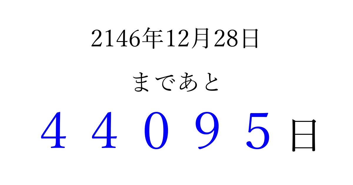 2146年12月28日(水)まで あと 99999 日です 追加すると、トップページからすぐ選べるようになります ※2026/04/06現在の結果です。 最新の状態に更新する ↓シェアして、タイムライン上にカウントダウンを表示しよう!↓ 📤 この結果を共有する Tweet シェア Threads Bluesky 別の日付でカウントダウン 2146年12月のカレンダー このページをブックマークに追加すると、いつでもカウントダウンを確認できます。 (PC: Ctrl+D / Mac: ⌘+D) hitome-notes.comでは以下のページも運営しています。 指定日と期間から日付を計算 | ガチャ確率計算・シミュレーション | プライバシー・ポリシー 運営者:Avocado