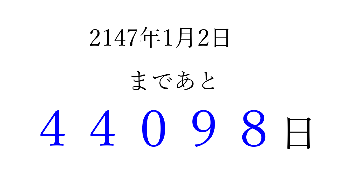 2147年1月2日(月)まで あと 99999 日です 追加すると、トップページからすぐ選べるようになります ※2026/04/08現在の結果です。 最新の状態に更新する ↓シェアして、タイムライン上にカウントダウンを表示しよう!↓ 📤 この結果を共有する Tweet シェア Threads Bluesky 別の日付でカウントダウン 2147年1月のカレンダー このページをブックマークに追加すると、いつでもカウントダウンを確認できます。 (PC: Ctrl+D / Mac: ⌘+D) hitome-notes.comでは以下のページも運営しています。 指定日と期間から日付を計算 | ガチャ確率計算・シミュレーション | プライバシー・ポリシー 運営者:Avocado