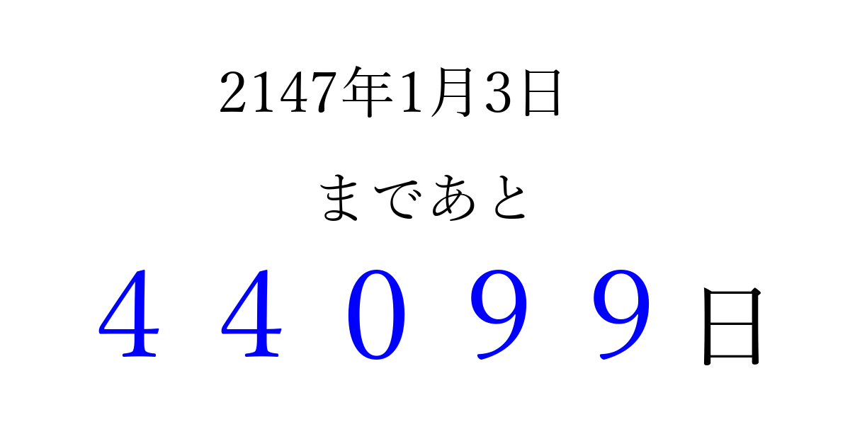 2147年1月3日(火)まで あと 99999 日です 追加すると、トップページからすぐ選べるようになります ※2026/04/08現在の結果です。 最新の状態に更新する ↓シェアして、タイムライン上にカウントダウンを表示しよう!↓ 📤 この結果を共有する Tweet シェア Threads Bluesky 別の日付でカウントダウン 2147年1月のカレンダー このページをブックマークに追加すると、いつでもカウントダウンを確認できます。 (PC: Ctrl+D / Mac: ⌘+D) hitome-notes.comでは以下のページも運営しています。 指定日と期間から日付を計算 | ガチャ確率計算・シミュレーション | プライバシー・ポリシー 運営者:Avocado