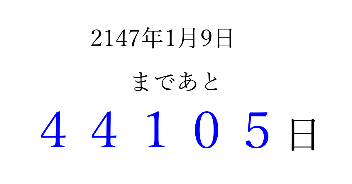 2147年1月9日(月)まで あと 99999 日です 追加すると、トップページからすぐ選べるようになります ※2026/04/08現在の結果です。 最新の状態に更新する ↓シェアして、タイムライン上にカウントダウンを表示しよう!↓ 📤 この結果を共有する Tweet シェア Threads Bluesky 別の日付でカウントダウン 2147年1月のカレンダー このページをブックマークに追加すると、いつでもカウントダウンを確認できます。 (PC: Ctrl+D / Mac: ⌘+D) hitome-notes.comでは以下のページも運営しています。 指定日と期間から日付を計算 | ガチャ確率計算・シミュレーション | プライバシー・ポリシー 運営者:Avocado