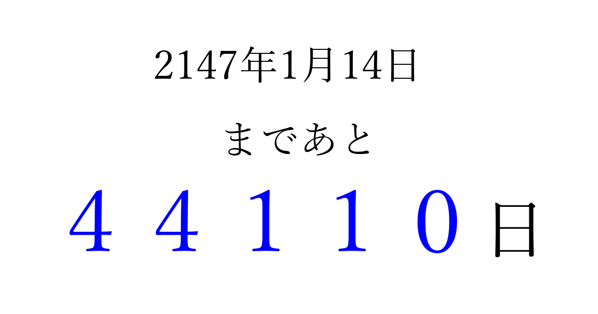 2147年1月14日(土)まで あと 99999 日です 追加すると、トップページからすぐ選べるようになります ※2026/04/08現在の結果です。 最新の状態に更新する ↓シェアして、タイムライン上にカウントダウンを表示しよう!↓ 📤 この結果を共有する Tweet シェア Threads Bluesky 別の日付でカウントダウン 2147年1月のカレンダー このページをブックマークに追加すると、いつでもカウントダウンを確認できます。 (PC: Ctrl+D / Mac: ⌘+D) hitome-notes.comでは以下のページも運営しています。 指定日と期間から日付を計算 | ガチャ確率計算・シミュレーション | プライバシー・ポリシー 運営者:Avocado