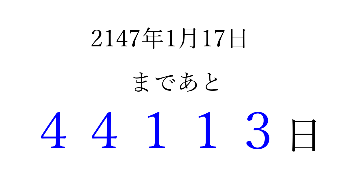 2147年1月17日(火)まで あと 99999 日です 追加すると、トップページからすぐ選べるようになります ※2026/04/08現在の結果です。 最新の状態に更新する ↓シェアして、タイムライン上にカウントダウンを表示しよう!↓ 📤 この結果を共有する Tweet シェア Threads Bluesky 別の日付でカウントダウン 2147年1月のカレンダー このページをブックマークに追加すると、いつでもカウントダウンを確認できます。 (PC: Ctrl+D / Mac: ⌘+D) hitome-notes.comでは以下のページも運営しています。 指定日と期間から日付を計算 | ガチャ確率計算・シミュレーション | プライバシー・ポリシー 運営者:Avocado