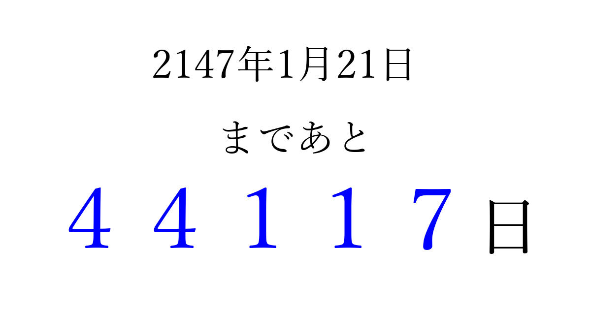 2147年1月21日(土)まで あと 99999 日です 追加すると、トップページからすぐ選べるようになります ※2026/04/08現在の結果です。 最新の状態に更新する ↓シェアして、タイムライン上にカウントダウンを表示しよう!↓ 📤 この結果を共有する Tweet シェア Threads Bluesky 別の日付でカウントダウン 2147年1月のカレンダー このページをブックマークに追加すると、いつでもカウントダウンを確認できます。 (PC: Ctrl+D / Mac: ⌘+D) hitome-notes.comでは以下のページも運営しています。 指定日と期間から日付を計算 | ガチャ確率計算・シミュレーション | プライバシー・ポリシー 運営者:Avocado