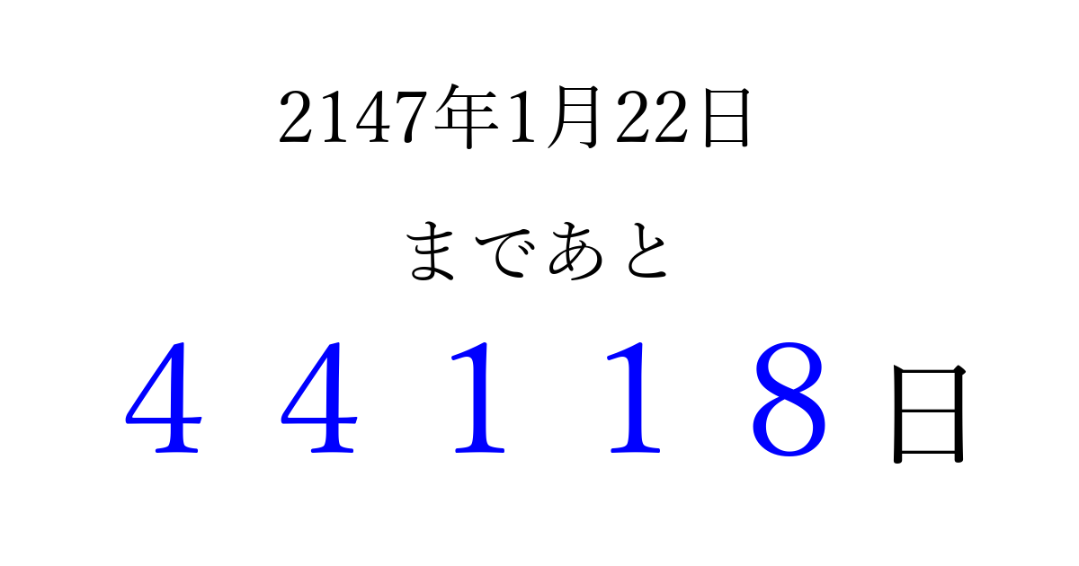 2147年1月22日(日)まで あと 99999 日です 追加すると、トップページからすぐ選べるようになります ※2026/04/08現在の結果です。 最新の状態に更新する ↓シェアして、タイムライン上にカウントダウンを表示しよう!↓ 📤 この結果を共有する Tweet シェア Threads Bluesky 別の日付でカウントダウン 2147年1月のカレンダー このページをブックマークに追加すると、いつでもカウントダウンを確認できます。 (PC: Ctrl+D / Mac: ⌘+D) hitome-notes.comでは以下のページも運営しています。 指定日と期間から日付を計算 | ガチャ確率計算・シミュレーション | プライバシー・ポリシー 運営者:Avocado