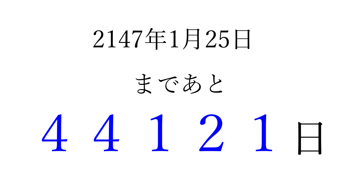 2147年1月25日(水)まで あと 99999 日です 追加すると、トップページからすぐ選べるようになります ※2026/04/08現在の結果です。 最新の状態に更新する ↓シェアして、タイムライン上にカウントダウンを表示しよう!↓ 📤 この結果を共有する Tweet シェア Threads Bluesky 別の日付でカウントダウン 2147年1月のカレンダー このページをブックマークに追加すると、いつでもカウントダウンを確認できます。 (PC: Ctrl+D / Mac: ⌘+D) hitome-notes.comでは以下のページも運営しています。 指定日と期間から日付を計算 | ガチャ確率計算・シミュレーション | プライバシー・ポリシー 運営者:Avocado