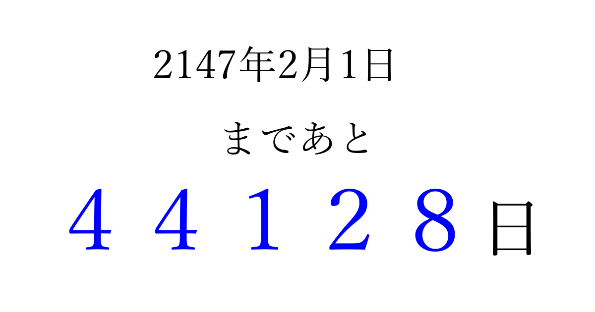 2147年2月1日(水)まで あと 99999 日です 追加すると、トップページからすぐ選べるようになります ※2026/04/08現在の結果です。 最新の状態に更新する ↓シェアして、タイムライン上にカウントダウンを表示しよう!↓ 📤 この結果を共有する Tweet シェア Threads Bluesky 別の日付でカウントダウン 2147年2月のカレンダー このページをブックマークに追加すると、いつでもカウントダウンを確認できます。 (PC: Ctrl+D / Mac: ⌘+D) hitome-notes.comでは以下のページも運営しています。 指定日と期間から日付を計算 | ガチャ確率計算・シミュレーション | プライバシー・ポリシー 運営者:Avocado