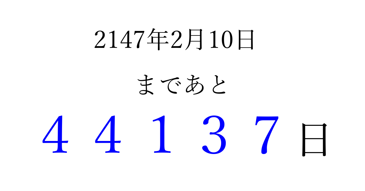 2147年2月10日(金)まで あと 99999 日です 追加すると、トップページからすぐ選べるようになります ※2026/04/08現在の結果です。 最新の状態に更新する ↓シェアして、タイムライン上にカウントダウンを表示しよう!↓ 📤 この結果を共有する Tweet シェア Threads Bluesky 別の日付でカウントダウン 2147年2月のカレンダー このページをブックマークに追加すると、いつでもカウントダウンを確認できます。 (PC: Ctrl+D / Mac: ⌘+D) hitome-notes.comでは以下のページも運営しています。 指定日と期間から日付を計算 | ガチャ確率計算・シミュレーション | プライバシー・ポリシー 運営者:Avocado
