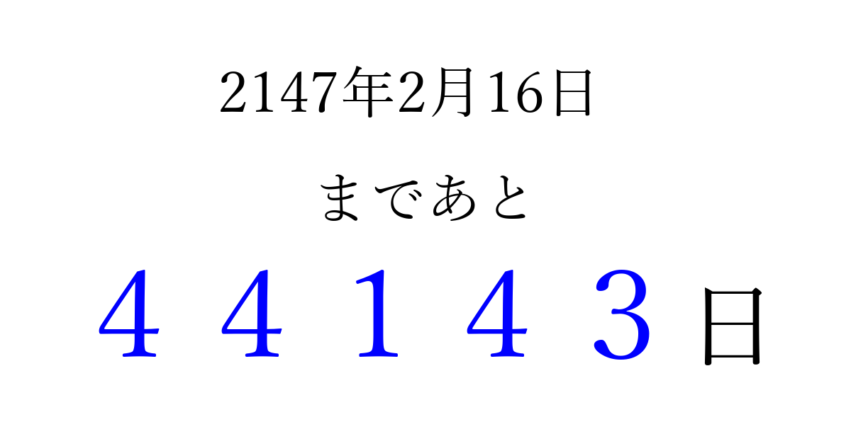 2147年2月16日(木)まで あと 99999 日です 追加すると、トップページからすぐ選べるようになります ※2026/04/08現在の結果です。 最新の状態に更新する ↓シェアして、タイムライン上にカウントダウンを表示しよう!↓ 📤 この結果を共有する Tweet シェア Threads Bluesky 別の日付でカウントダウン 2147年2月のカレンダー このページをブックマークに追加すると、いつでもカウントダウンを確認できます。 (PC: Ctrl+D / Mac: ⌘+D) hitome-notes.comでは以下のページも運営しています。 指定日と期間から日付を計算 | ガチャ確率計算・シミュレーション | プライバシー・ポリシー 運営者:Avocado