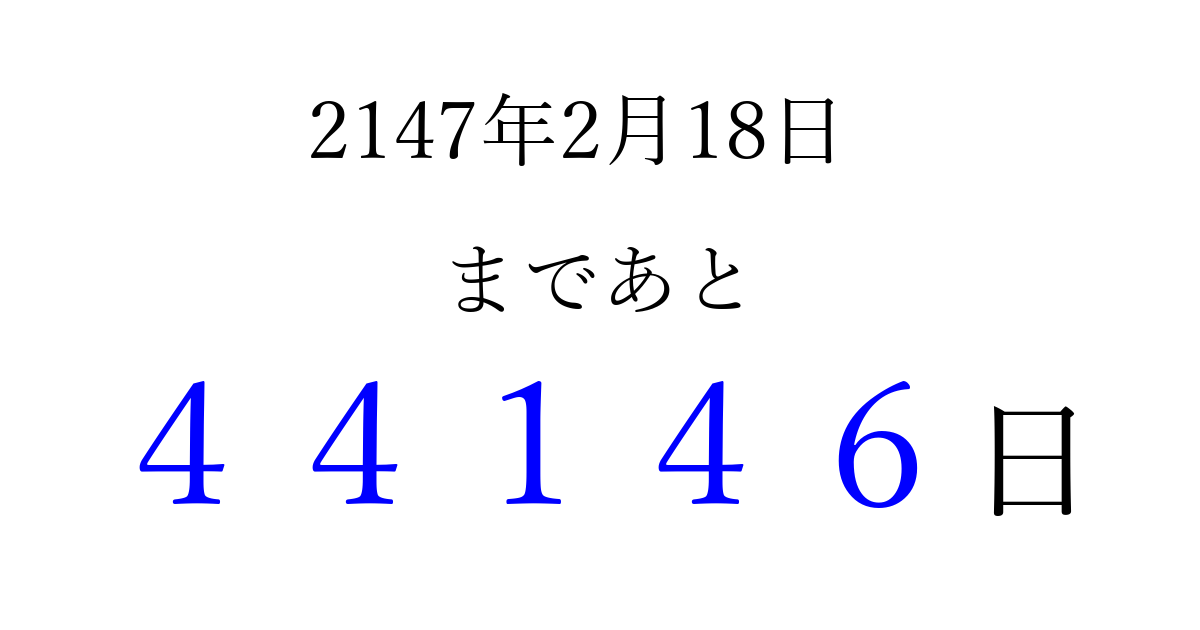 2147年2月18日(土)まで あと 99999 日です 追加すると、トップページからすぐ選べるようになります ※2026/04/07現在の結果です。 最新の状態に更新する ↓シェアして、タイムライン上にカウントダウンを表示しよう!↓ 📤 この結果を共有する Tweet シェア Threads Bluesky 別の日付でカウントダウン 2147年2月のカレンダー このページをブックマークに追加すると、いつでもカウントダウンを確認できます。 (PC: Ctrl+D / Mac: ⌘+D) hitome-notes.comでは以下のページも運営しています。 指定日と期間から日付を計算 | ガチャ確率計算・シミュレーション | プライバシー・ポリシー 運営者:Avocado