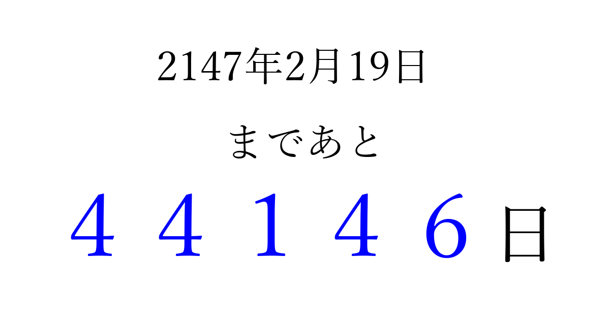 2147年2月19日(日)まで あと 99999 日です 追加すると、トップページからすぐ選べるようになります ※2026/04/08現在の結果です。 最新の状態に更新する ↓シェアして、タイムライン上にカウントダウンを表示しよう!↓ 📤 この結果を共有する Tweet シェア Threads Bluesky 別の日付でカウントダウン 2147年2月のカレンダー このページをブックマークに追加すると、いつでもカウントダウンを確認できます。 (PC: Ctrl+D / Mac: ⌘+D) hitome-notes.comでは以下のページも運営しています。 指定日と期間から日付を計算 | ガチャ確率計算・シミュレーション | プライバシー・ポリシー 運営者:Avocado