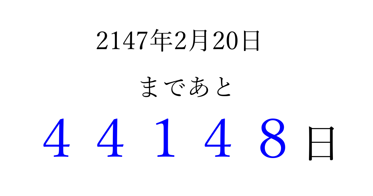 2147年2月20日(月)まで あと 99999 日です 追加すると、トップページからすぐ選べるようになります ※2026/04/07現在の結果です。 最新の状態に更新する ↓シェアして、タイムライン上にカウントダウンを表示しよう!↓ 📤 この結果を共有する Tweet シェア Threads Bluesky 別の日付でカウントダウン 2147年2月のカレンダー このページをブックマークに追加すると、いつでもカウントダウンを確認できます。 (PC: Ctrl+D / Mac: ⌘+D) hitome-notes.comでは以下のページも運営しています。 指定日と期間から日付を計算 | ガチャ確率計算・シミュレーション | プライバシー・ポリシー 運営者:Avocado
