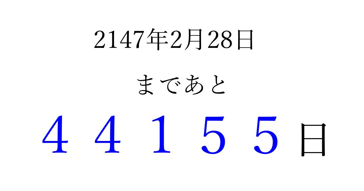 2147年2月28日(火)まで あと 99999 日です 追加すると、トップページからすぐ選べるようになります ※2026/04/08現在の結果です。 最新の状態に更新する ↓シェアして、タイムライン上にカウントダウンを表示しよう!↓ 📤 この結果を共有する Tweet シェア Threads Bluesky 別の日付でカウントダウン 2147年2月のカレンダー このページをブックマークに追加すると、いつでもカウントダウンを確認できます。 (PC: Ctrl+D / Mac: ⌘+D) hitome-notes.comでは以下のページも運営しています。 指定日と期間から日付を計算 | ガチャ確率計算・シミュレーション | プライバシー・ポリシー 運営者:Avocado