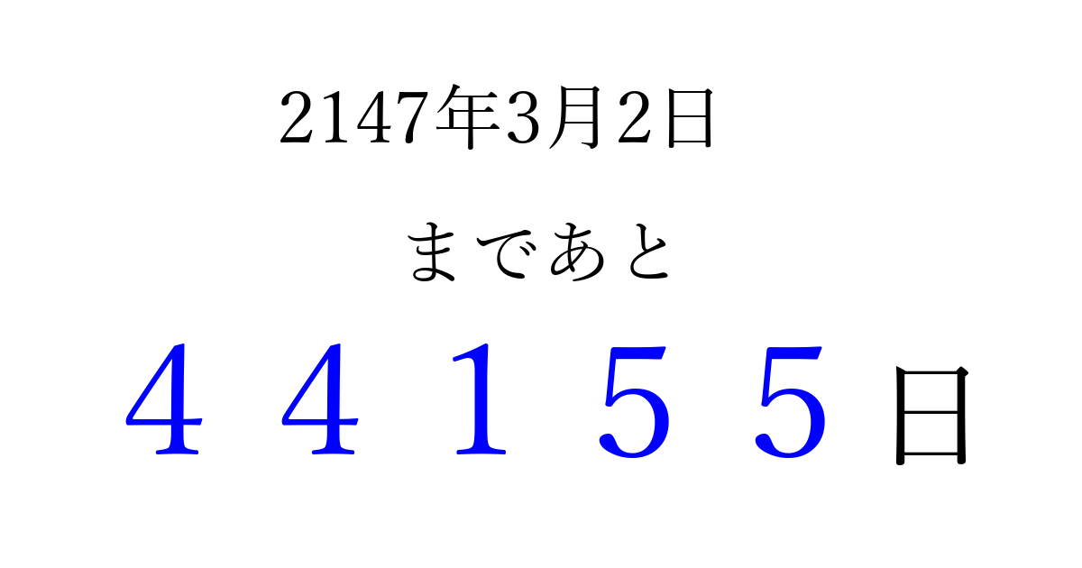 2147年3月2日(木)まで あと 99999 日です 追加すると、トップページからすぐ選べるようになります ※2026/04/10現在の結果です。 最新の状態に更新する ↓シェアして、タイムライン上にカウントダウンを表示しよう!↓ 📤 この結果を共有する Tweet シェア Threads Bluesky 別の日付でカウントダウン 2147年3月のカレンダー このページをブックマークに追加すると、いつでもカウントダウンを確認できます。 (PC: Ctrl+D / Mac: ⌘+D) hitome-notes.comでは以下のページも運営しています。 指定日と期間から日付を計算 | ガチャ確率計算・シミュレーション | プライバシー・ポリシー 運営者:Avocado