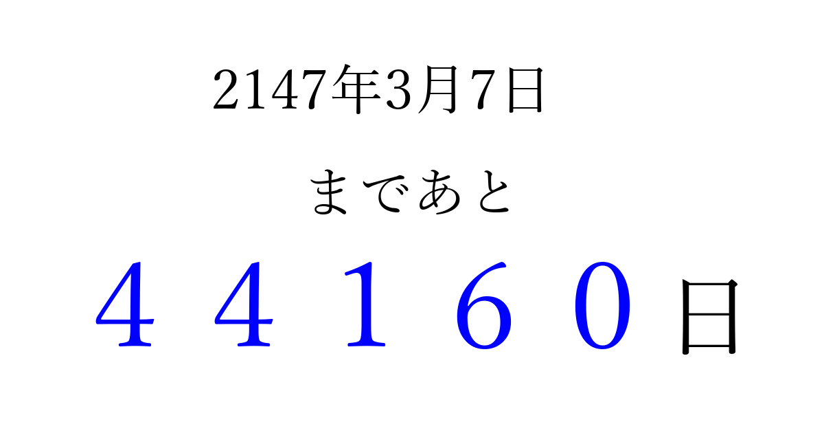 2147年3月7日(火)まで あと 99999 日です 追加すると、トップページからすぐ選べるようになります ※2026/04/10現在の結果です。 最新の状態に更新する ↓シェアして、タイムライン上にカウントダウンを表示しよう!↓ 📤 この結果を共有する Tweet シェア Threads Bluesky 別の日付でカウントダウン 2147年3月のカレンダー このページをブックマークに追加すると、いつでもカウントダウンを確認できます。 (PC: Ctrl+D / Mac: ⌘+D) hitome-notes.comでは以下のページも運営しています。 指定日と期間から日付を計算 | ガチャ確率計算・シミュレーション | プライバシー・ポリシー 運営者:Avocado