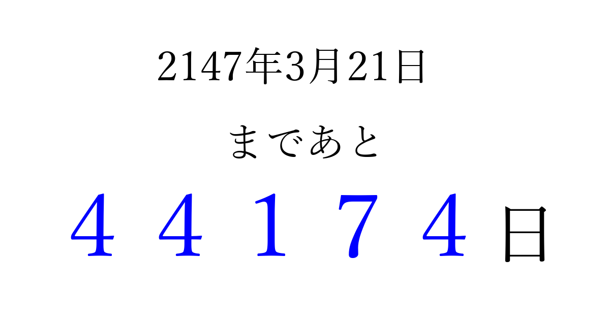 2147年3月21日(火)まで あと 99999 日です 追加すると、トップページからすぐ選べるようになります ※2026/04/10現在の結果です。 最新の状態に更新する ↓シェアして、タイムライン上にカウントダウンを表示しよう!↓ 📤 この結果を共有する Tweet シェア Threads Bluesky 別の日付でカウントダウン 2147年3月のカレンダー このページをブックマークに追加すると、いつでもカウントダウンを確認できます。 (PC: Ctrl+D / Mac: ⌘+D) hitome-notes.comでは以下のページも運営しています。 指定日と期間から日付を計算 | ガチャ確率計算・シミュレーション | プライバシー・ポリシー 運営者:Avocado