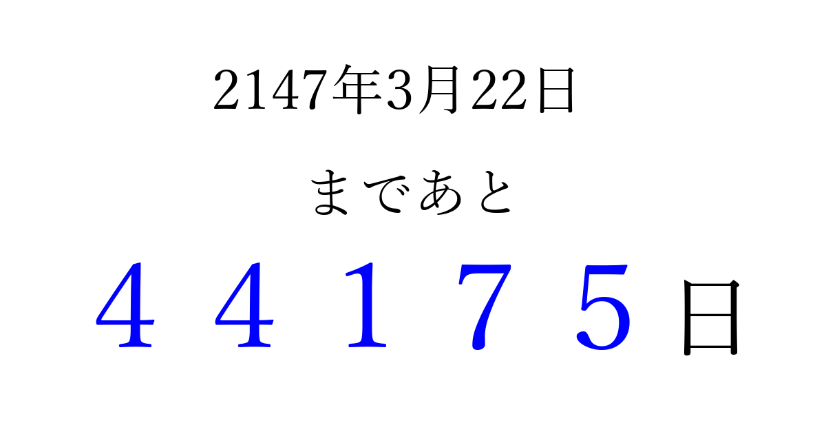 2147年3月22日(水)まで あと 99999 日です 追加すると、トップページからすぐ選べるようになります ※2026/04/10現在の結果です。 最新の状態に更新する ↓シェアして、タイムライン上にカウントダウンを表示しよう!↓ 📤 この結果を共有する Tweet シェア Threads Bluesky 別の日付でカウントダウン 2147年3月のカレンダー このページをブックマークに追加すると、いつでもカウントダウンを確認できます。 (PC: Ctrl+D / Mac: ⌘+D) hitome-notes.comでは以下のページも運営しています。 指定日と期間から日付を計算 | ガチャ確率計算・シミュレーション | プライバシー・ポリシー 運営者:Avocado
