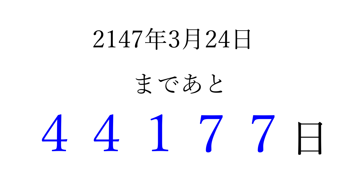 2147年3月24日(金)まで あと 99999 日です 追加すると、トップページからすぐ選べるようになります ※2026/04/10現在の結果です。 最新の状態に更新する ↓シェアして、タイムライン上にカウントダウンを表示しよう!↓ 📤 この結果を共有する Tweet シェア Threads Bluesky 別の日付でカウントダウン 2147年3月のカレンダー このページをブックマークに追加すると、いつでもカウントダウンを確認できます。 (PC: Ctrl+D / Mac: ⌘+D) hitome-notes.comでは以下のページも運営しています。 指定日と期間から日付を計算 | ガチャ確率計算・シミュレーション | プライバシー・ポリシー 運営者:Avocado
