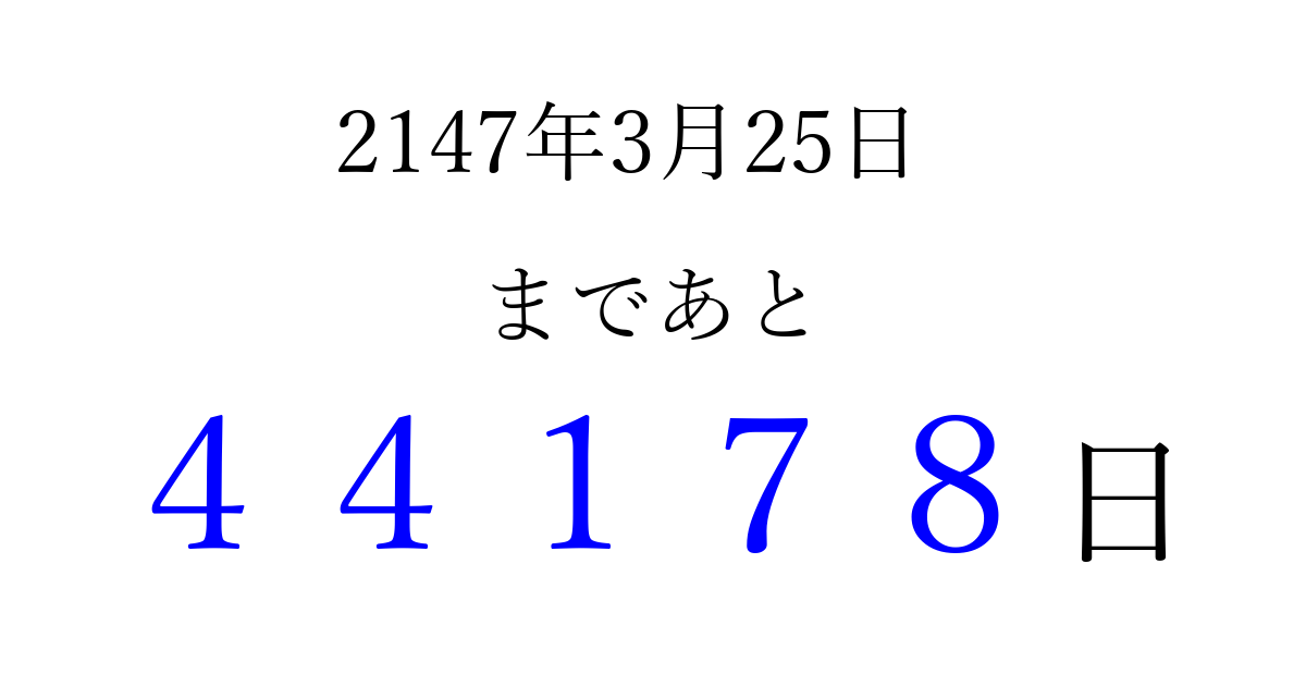 2147年3月25日(土)まで あと 99999 日です 追加すると、トップページからすぐ選べるようになります ※2026/04/10現在の結果です。 最新の状態に更新する ↓シェアして、タイムライン上にカウントダウンを表示しよう!↓ 📤 この結果を共有する Tweet シェア Threads Bluesky 別の日付でカウントダウン 2147年3月のカレンダー このページをブックマークに追加すると、いつでもカウントダウンを確認できます。 (PC: Ctrl+D / Mac: ⌘+D) hitome-notes.comでは以下のページも運営しています。 指定日と期間から日付を計算 | ガチャ確率計算・シミュレーション | プライバシー・ポリシー 運営者:Avocado