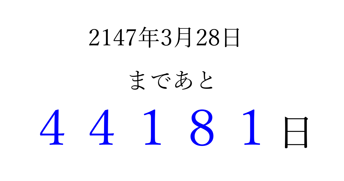 2147年3月28日(火)まで あと 99999 日です 追加すると、トップページからすぐ選べるようになります ※2026/04/10現在の結果です。 最新の状態に更新する ↓シェアして、タイムライン上にカウントダウンを表示しよう!↓ 📤 この結果を共有する Tweet シェア Threads Bluesky 別の日付でカウントダウン 2147年3月のカレンダー このページをブックマークに追加すると、いつでもカウントダウンを確認できます。 (PC: Ctrl+D / Mac: ⌘+D) hitome-notes.comでは以下のページも運営しています。 指定日と期間から日付を計算 | ガチャ確率計算・シミュレーション | プライバシー・ポリシー 運営者:Avocado