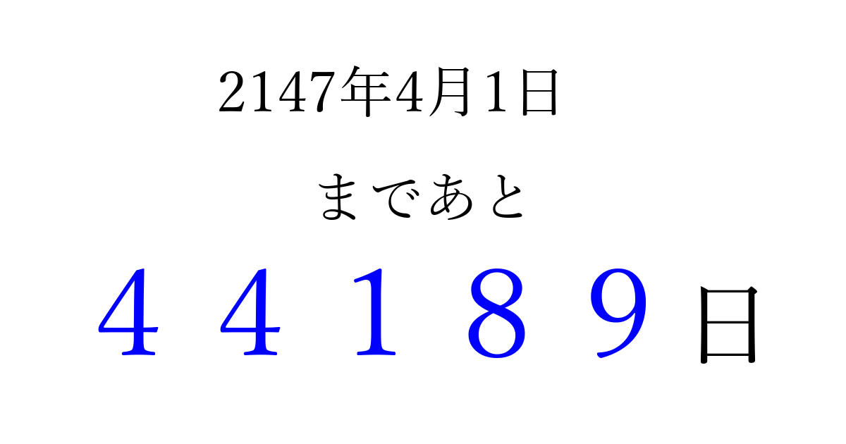 2147年4月1日(土)まで あと 99999 日です 追加すると、トップページからすぐ選べるようになります ※2026/04/06現在の結果です。 最新の状態に更新する ↓シェアして、タイムライン上にカウントダウンを表示しよう!↓ 📤 この結果を共有する Tweet シェア Threads Bluesky 別の日付でカウントダウン 2147年4月のカレンダー このページをブックマークに追加すると、いつでもカウントダウンを確認できます。 (PC: Ctrl+D / Mac: ⌘+D) hitome-notes.comでは以下のページも運営しています。 指定日と期間から日付を計算 | ガチャ確率計算・シミュレーション | プライバシー・ポリシー 運営者:Avocado