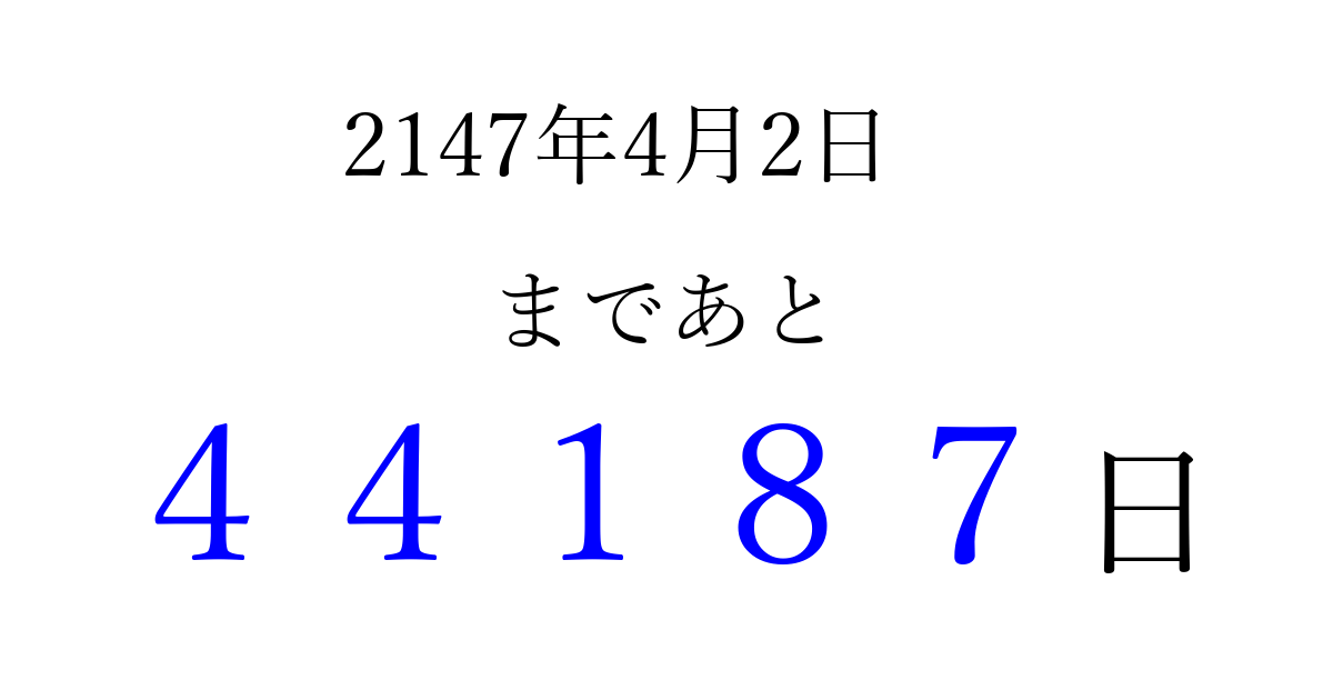 2147年4月2日(日)まで あと 99999 日です 追加すると、トップページからすぐ選べるようになります ※2026/04/09現在の結果です。 最新の状態に更新する ↓シェアして、タイムライン上にカウントダウンを表示しよう!↓ 📤 この結果を共有する Tweet シェア Threads Bluesky 別の日付でカウントダウン 2147年4月のカレンダー このページをブックマークに追加すると、いつでもカウントダウンを確認できます。 (PC: Ctrl+D / Mac: ⌘+D) hitome-notes.comでは以下のページも運営しています。 指定日と期間から日付を計算 | ガチャ確率計算・シミュレーション | プライバシー・ポリシー 運営者:Avocado