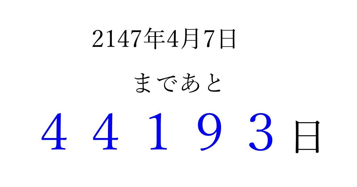 2147年4月7日(金)まで あと 99999 日です 追加すると、トップページからすぐ選べるようになります ※2026/04/08現在の結果です。 最新の状態に更新する ↓シェアして、タイムライン上にカウントダウンを表示しよう!↓ 📤 この結果を共有する Tweet シェア Threads Bluesky 別の日付でカウントダウン 2147年4月のカレンダー このページをブックマークに追加すると、いつでもカウントダウンを確認できます。 (PC: Ctrl+D / Mac: ⌘+D) hitome-notes.comでは以下のページも運営しています。 指定日と期間から日付を計算 | ガチャ確率計算・シミュレーション | プライバシー・ポリシー 運営者:Avocado