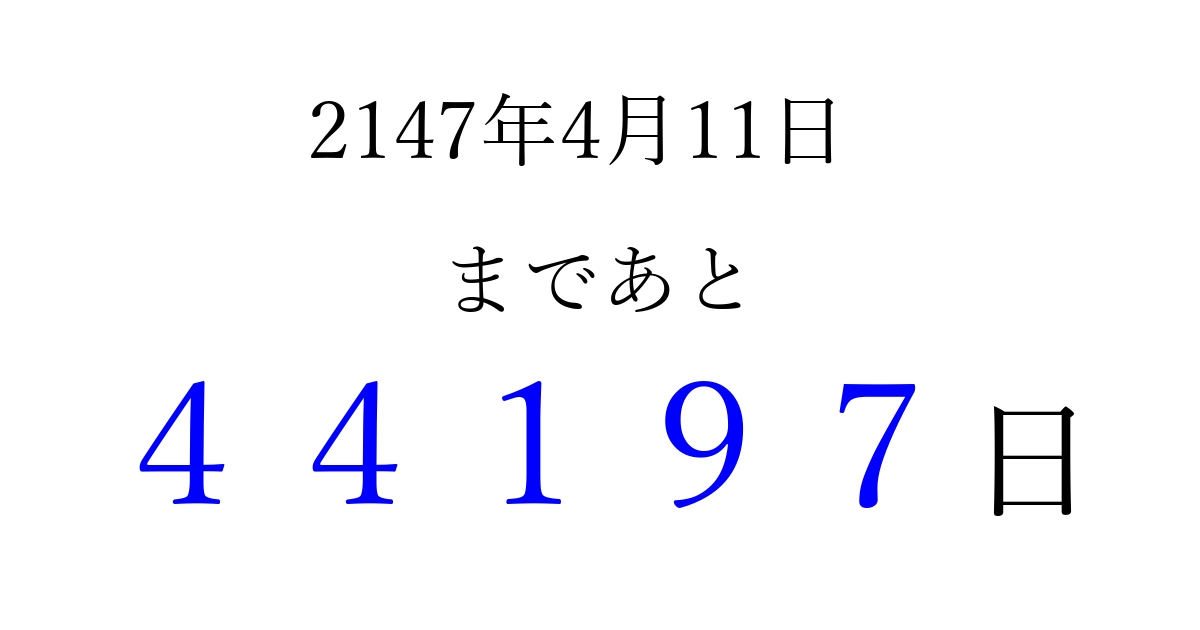 2147年4月11日(火)まで あと 99999 日です 追加すると、トップページからすぐ選べるようになります ※2026/04/08現在の結果です。 最新の状態に更新する ↓シェアして、タイムライン上にカウントダウンを表示しよう!↓ 📤 この結果を共有する Tweet シェア Threads Bluesky 別の日付でカウントダウン 2147年4月のカレンダー このページをブックマークに追加すると、いつでもカウントダウンを確認できます。 (PC: Ctrl+D / Mac: ⌘+D) hitome-notes.comでは以下のページも運営しています。 指定日と期間から日付を計算 | ガチャ確率計算・シミュレーション | プライバシー・ポリシー 運営者:Avocado