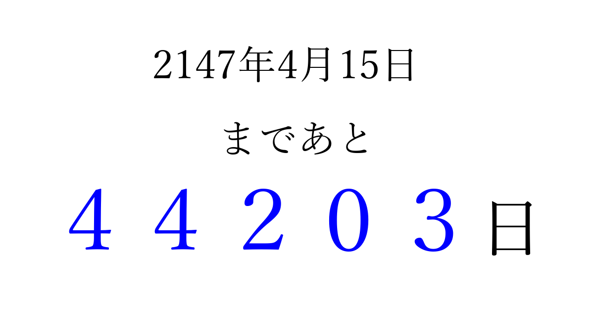 2147年4月15日(土)まで あと 99999 日です 追加すると、トップページからすぐ選べるようになります ※2026/04/06現在の結果です。 最新の状態に更新する ↓シェアして、タイムライン上にカウントダウンを表示しよう!↓ 📤 この結果を共有する Tweet シェア Threads Bluesky 別の日付でカウントダウン 2147年4月のカレンダー このページをブックマークに追加すると、いつでもカウントダウンを確認できます。 (PC: Ctrl+D / Mac: ⌘+D) hitome-notes.comでは以下のページも運営しています。 指定日と期間から日付を計算 | ガチャ確率計算・シミュレーション | プライバシー・ポリシー 運営者:Avocado