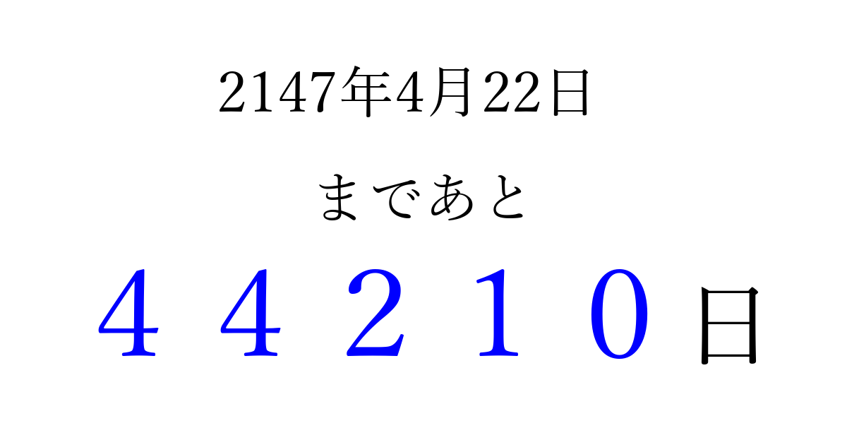 2147年4月22日(土)まで あと 99999 日です 追加すると、トップページからすぐ選べるようになります ※2026/04/06現在の結果です。 最新の状態に更新する ↓シェアして、タイムライン上にカウントダウンを表示しよう!↓ 📤 この結果を共有する Tweet シェア Threads Bluesky 別の日付でカウントダウン 2147年4月のカレンダー このページをブックマークに追加すると、いつでもカウントダウンを確認できます。 (PC: Ctrl+D / Mac: ⌘+D) hitome-notes.comでは以下のページも運営しています。 指定日と期間から日付を計算 | ガチャ確率計算・シミュレーション | プライバシー・ポリシー 運営者:Avocado