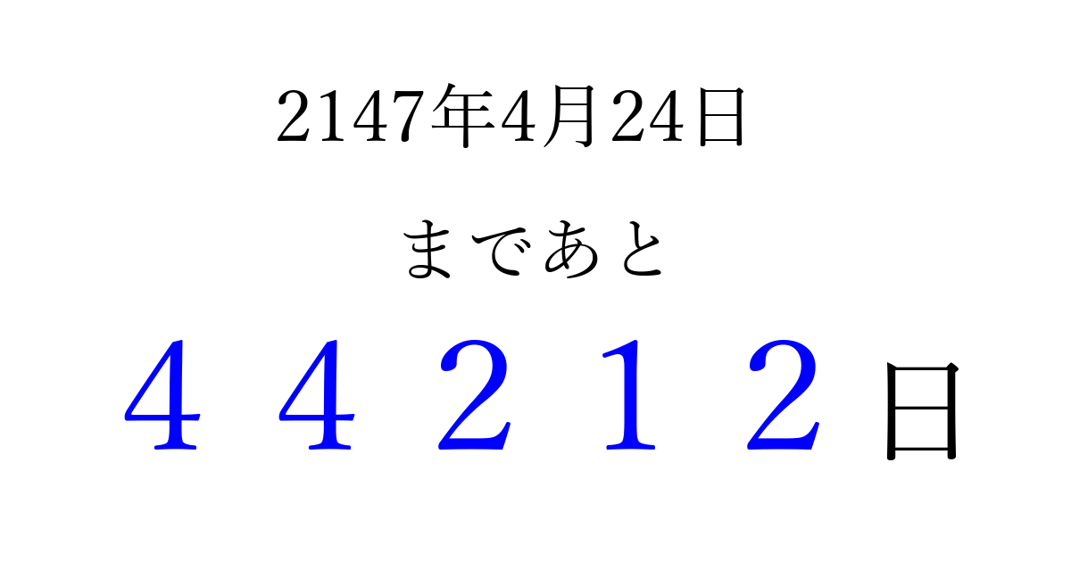 2147年4月24日(月)まで あと 99999 日です 追加すると、トップページからすぐ選べるようになります ※2026/04/06現在の結果です。 最新の状態に更新する ↓シェアして、タイムライン上にカウントダウンを表示しよう!↓ 📤 この結果を共有する Tweet シェア Threads Bluesky 別の日付でカウントダウン 2147年4月のカレンダー このページをブックマークに追加すると、いつでもカウントダウンを確認できます。 (PC: Ctrl+D / Mac: ⌘+D) hitome-notes.comでは以下のページも運営しています。 指定日と期間から日付を計算 | ガチャ確率計算・シミュレーション | プライバシー・ポリシー 運営者:Avocado