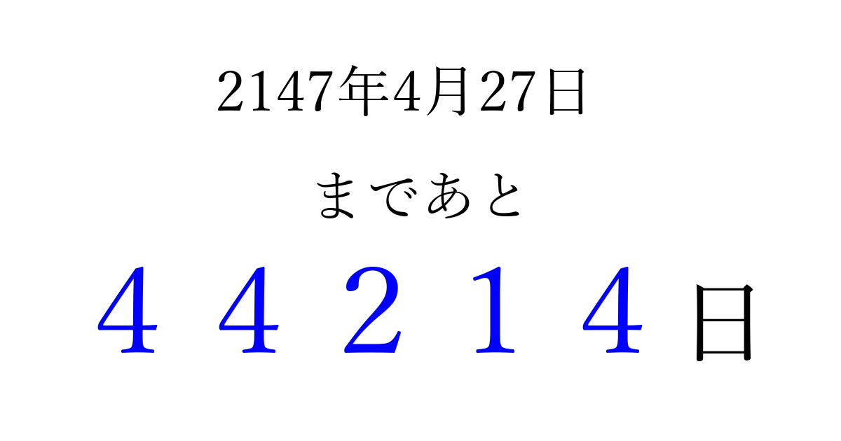 2147年4月27日(木)まで あと 99999 日です 追加すると、トップページからすぐ選べるようになります ※2026/04/07現在の結果です。 最新の状態に更新する ↓シェアして、タイムライン上にカウントダウンを表示しよう!↓ 📤 この結果を共有する Tweet シェア Threads Bluesky 別の日付でカウントダウン 2147年4月のカレンダー このページをブックマークに追加すると、いつでもカウントダウンを確認できます。 (PC: Ctrl+D / Mac: ⌘+D) hitome-notes.comでは以下のページも運営しています。 指定日と期間から日付を計算 | ガチャ確率計算・シミュレーション | プライバシー・ポリシー 運営者:Avocado